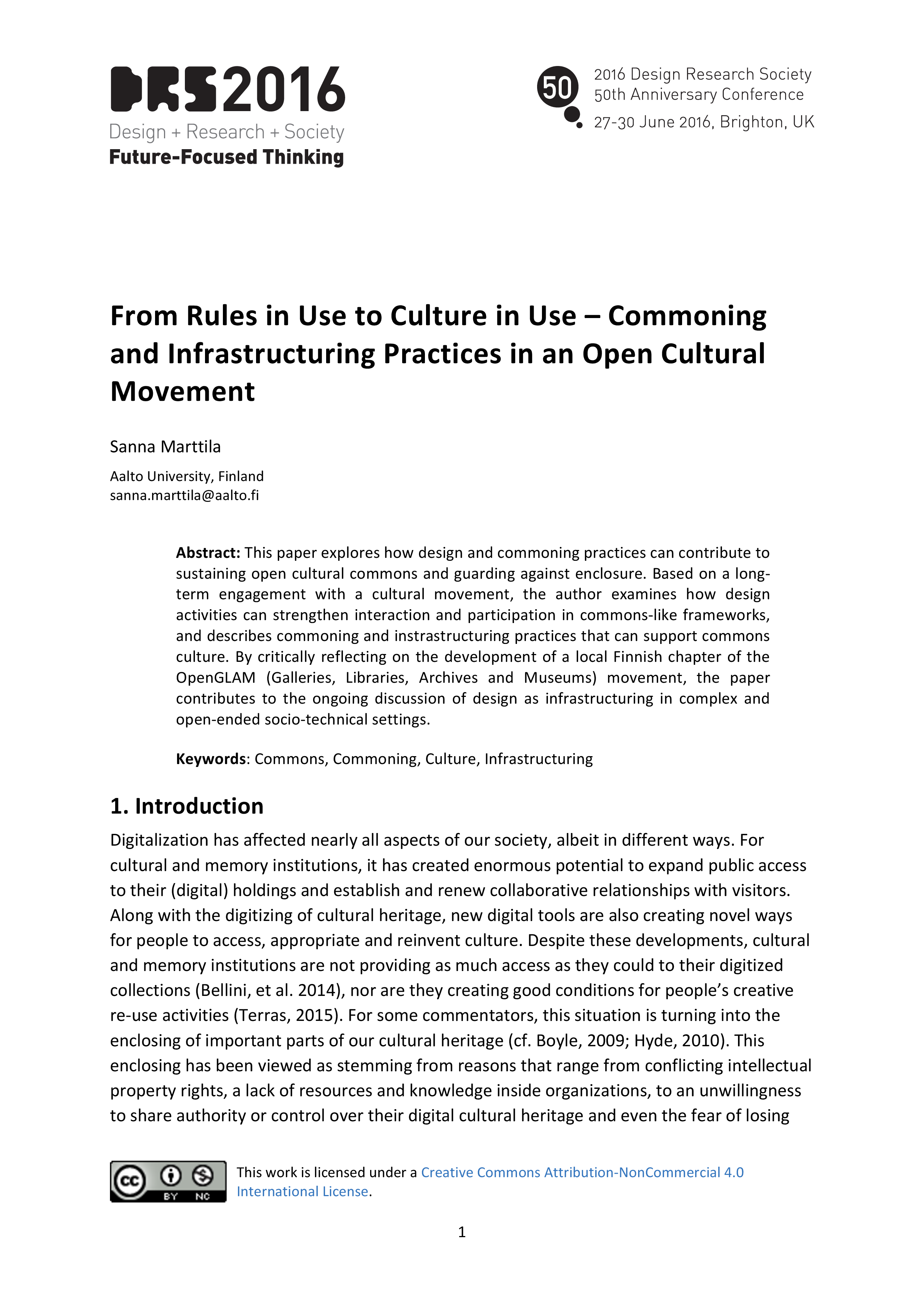 Cite this paper: Marttila, S. (2016) From rules in use to culture in use — Commoning and infrastructuring practices in an open cultural movement. Proceedings of DRS 2016, Design Research Society 50th Anniversary Conference. Brighton, UK, 27–30 June 2016.
